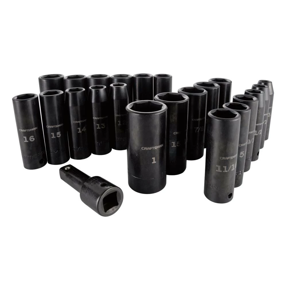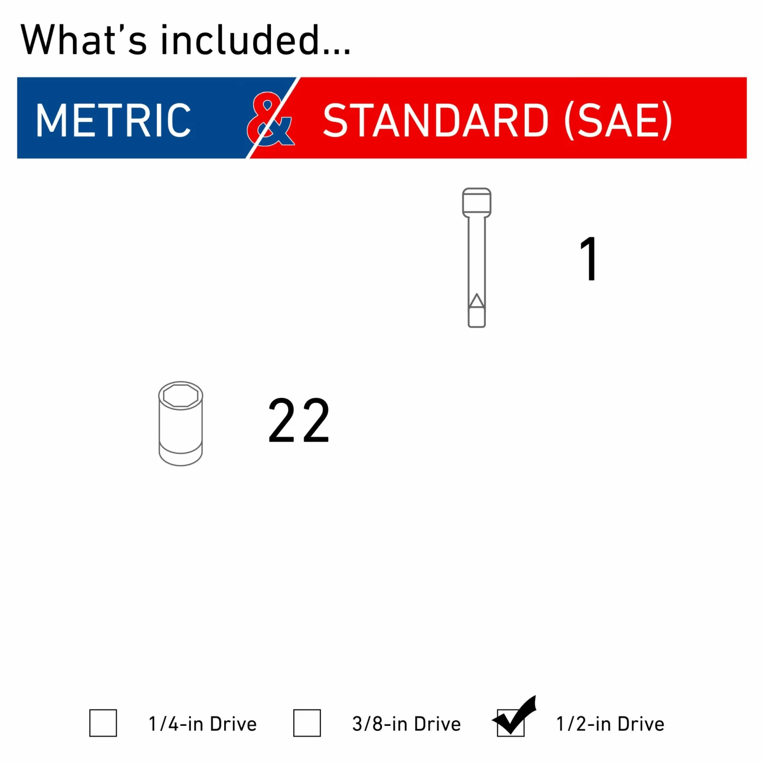 - Includes (11) 1/2-in Dr Deep Impact Sockets SAE (3/8, 7/16, 1/2, 9/16, 5/8, 11/16, 3/4, 13/16, 7/8, 15/16 and 1-in), (11) 1/2-in Dr Deep Impact Sockets Metric (12, 13, 14, 15, 16, 17, 18, 19, 21, 22 and 24 mm) and (1) 1/2-in Dr Impact Extension Bar (3-in)