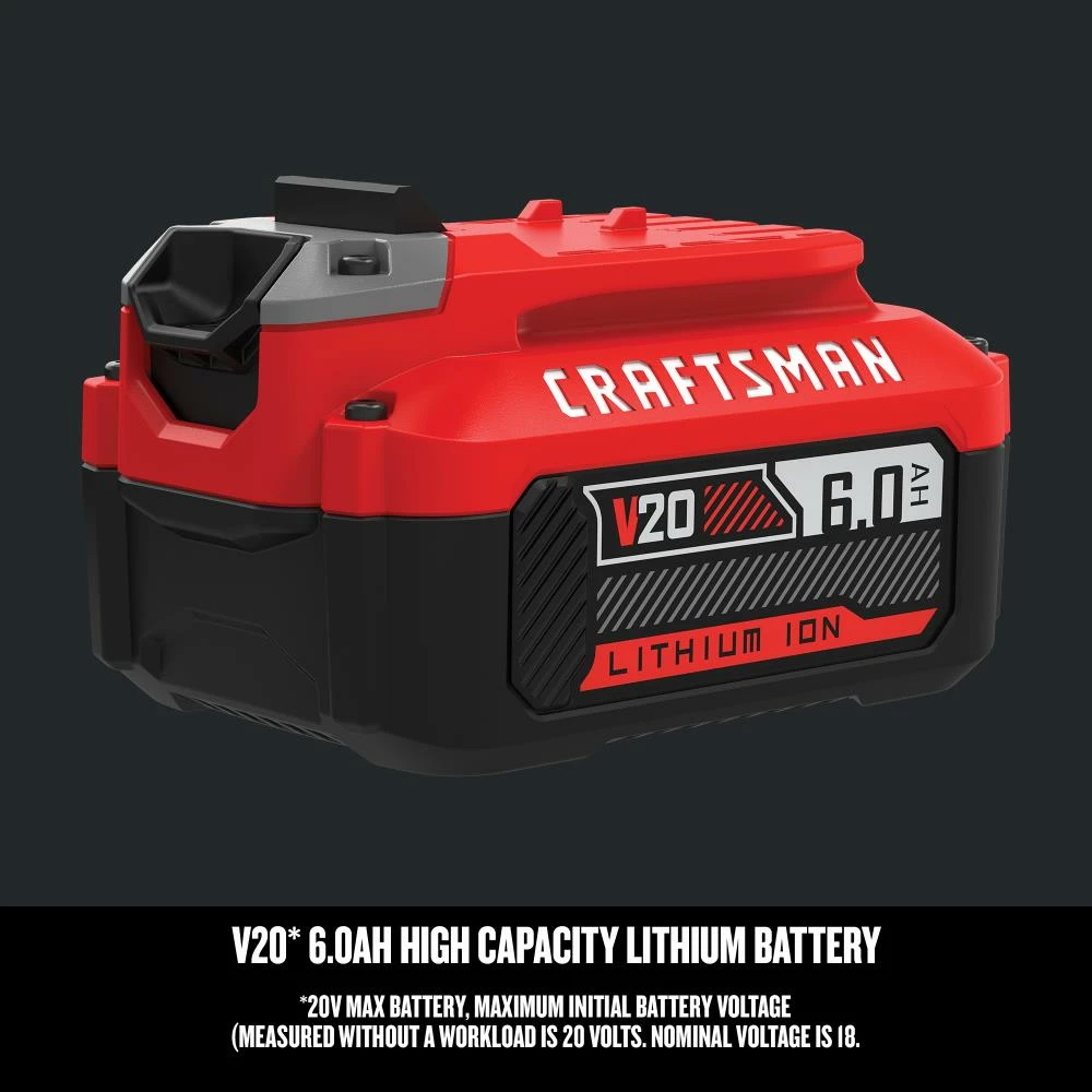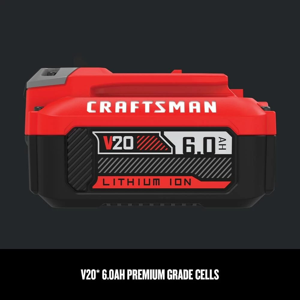 V20 6.0Ah Lithium Ion Battery is made with you in mind. The battery offers premium grade high performance cells for improved power providing up to 4.5x longer runtime than a standard battery. No memory and low self-discharge means this battery is ready when you are. It is compatible with the CRAFTSMAN® V20 20V MAX cordless power tool and outdoor tool lineup.