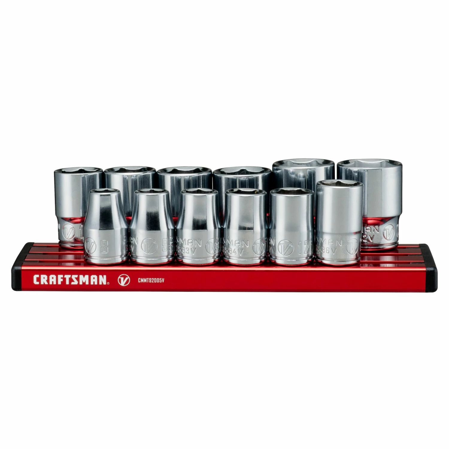 The V-Series 12PC. 3/8″ Drive Metric 6-Point Socket Set delivers unprecendented performance to the Craftsman brand. Engineered for professionals, this socket set features a magnetic socket rail for easy socket storage and organization. The sockets have premium features such as the 6-Point Socket Geometry that maximizes torque onto the flats of fasteners with an off-corner design. Other features include a chamfered and tapered tip design, which provides users with quicker socket-to-fastener engagement. Backed by Craftsman’s Lifetime Warranty, this product is designed to deliver the quality and durability expected from the Craftsman brand. If the product fails to perform for any reason, we will replace it. Return damaged product to a stocking Retail Partner or call 1-888-331-4569 for details. No proof of purchase required.