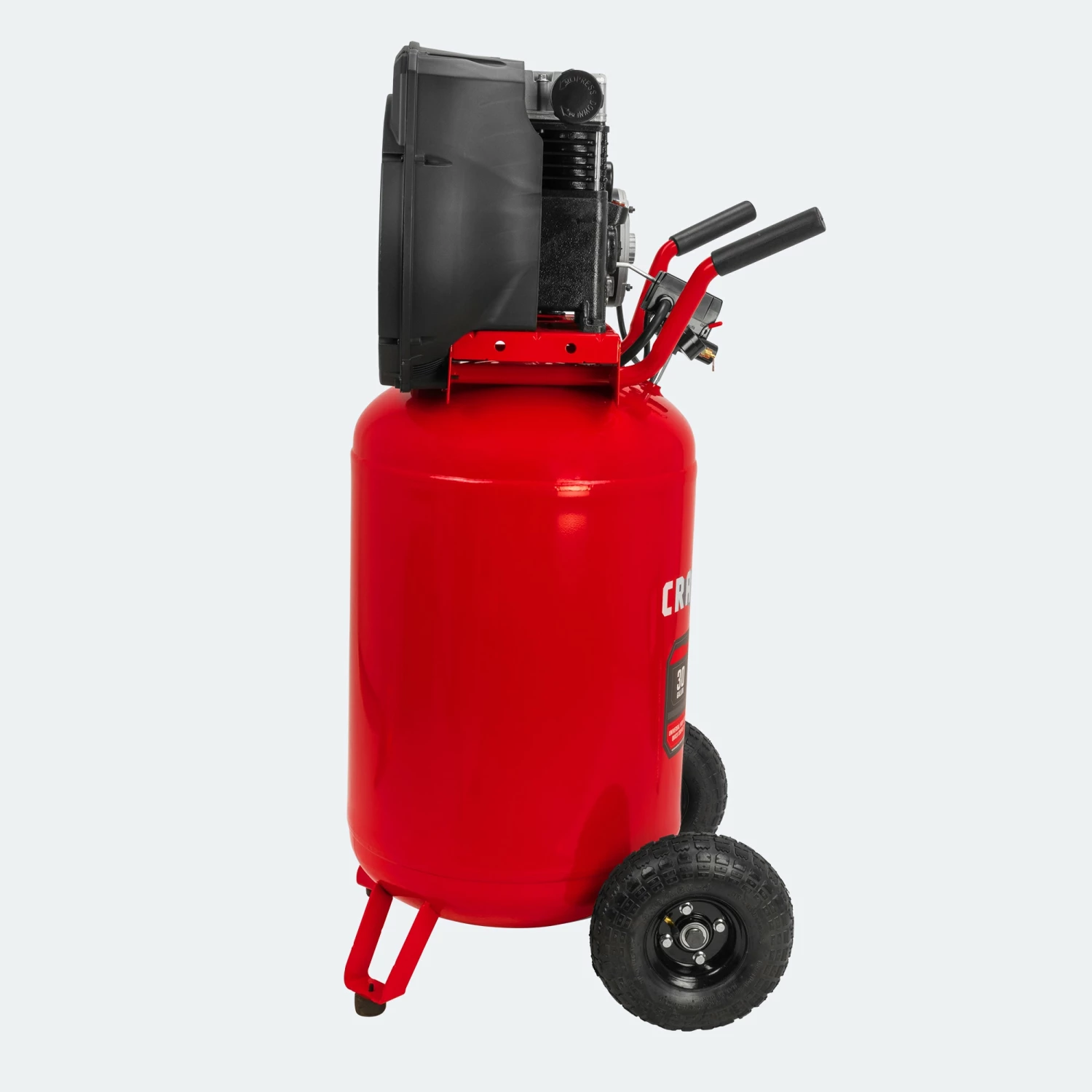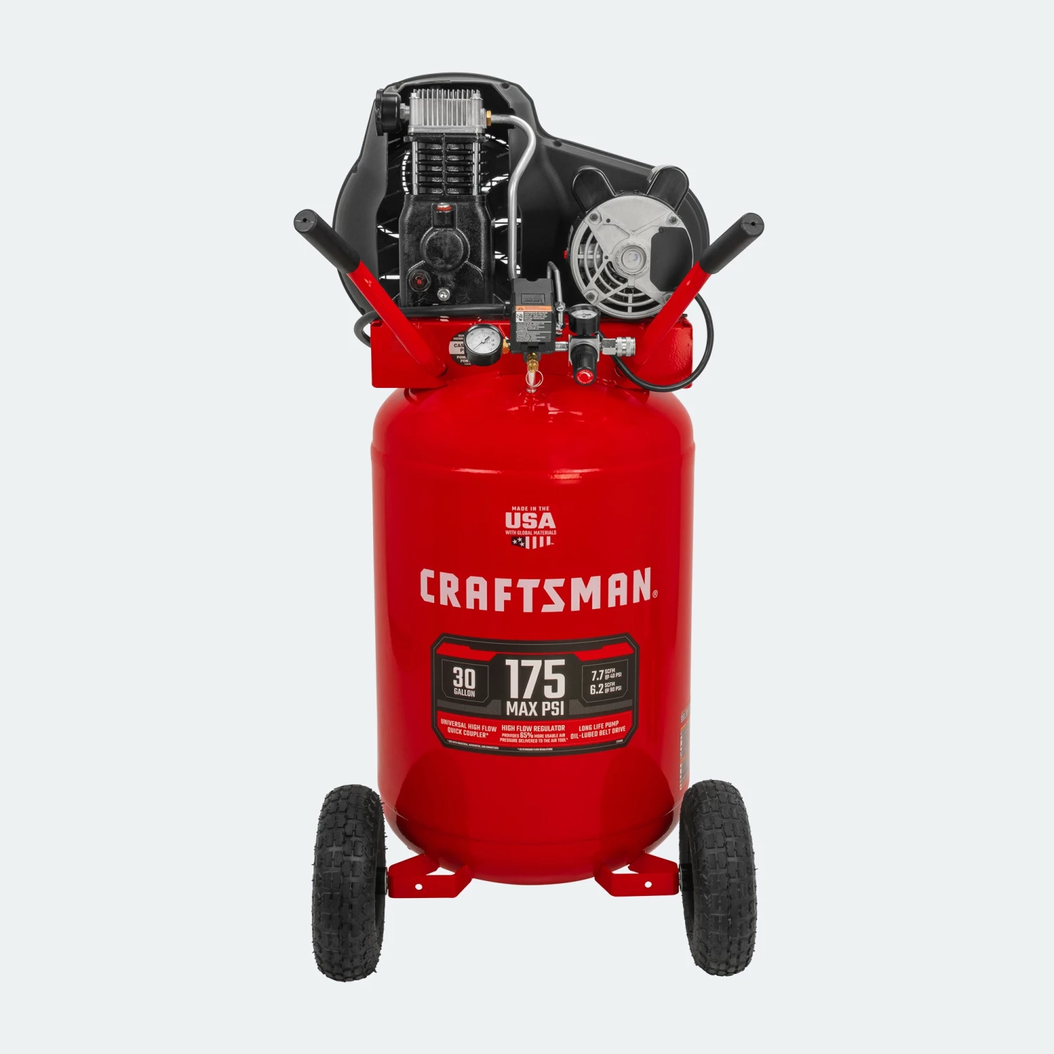 One of the more powerful air compressors currently available for consumers, the Craftsman 30 gallon air compressor features an innovative twin cylinder online oil lube pump that delivers 175 max PSI along with 6.2 SCFM at 90 PSI. At 76 dBA, the oil lubricated twin cylinder pump with cast iron construction is 23% quieter versus Porter Cable 30 gallon 135 PSI compressors. The Craftsman 30 gallon air compressor is equipped with a high flow regulator that provides 65% more usable air pressure delivered to the air tool. The vertical portable space saving tank design and pneumatic 10 in. wheels make it easy to move around the shop, garage, or on a work site. Whether you want to inflate your tires, work under the hood or do some medium duty metal working, the Craftsman 30 Gallon oil lube vertical air compressor is perfect for the job.