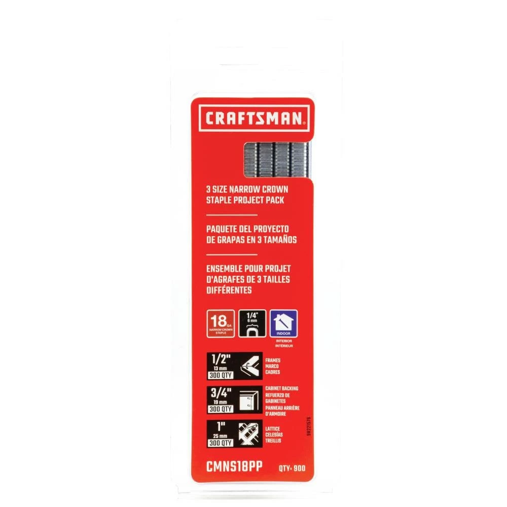 The Craftsman 3 size 18-gauge narrow crown staple project pack is designed for indoor use only, with stapling projects such as frames, cabinet backing, and lattice work