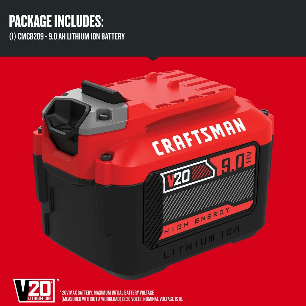 V20 9.0Ah Lithium Ion Battery is made with you in mind. The battery offers premium grade high performance cells for improved power providing up to 4.5x longer runtime than a standard battery. No memory and low self-discharge means this battery is ready when you are. It is compatible with the CRAFTSMAN® V20 20V MAX cordless power tool and outdoor tool lineup.