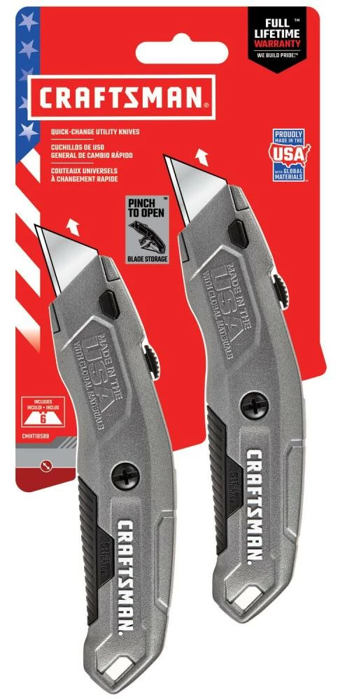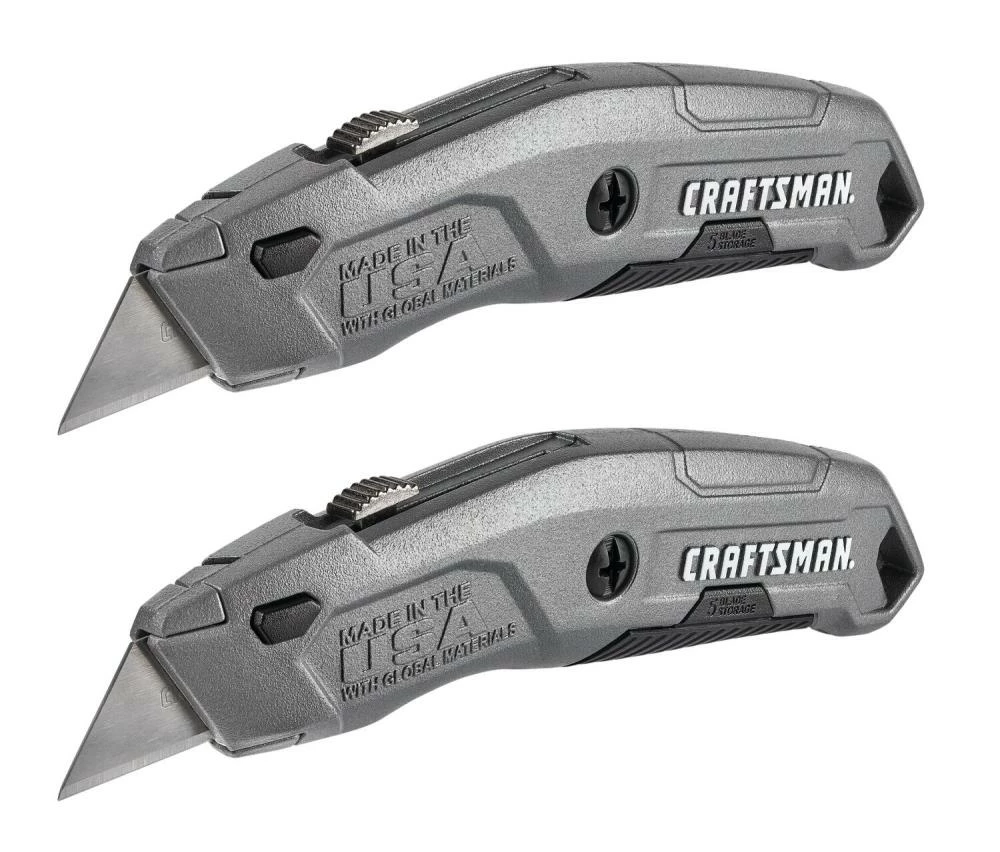 Step up convenience with this durable, made in USA, CRAFTSMAN® retractable knife. Complete with quick blade change button and easy open blade storage. And then double it with this 2-pack. Keep one in the garage and the other in the tool box. Or give one to your buddy who always seems to need to borrow your knife.