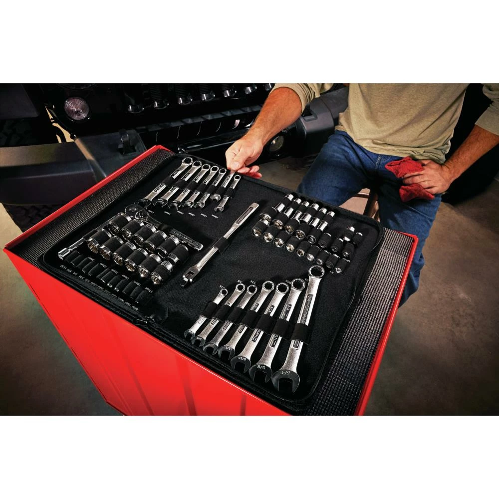 66 pc Mobile Mechanics Tool Set comes equipped with a 72 Tooth ratchet, a broad assortment of drive tools, and a soft zipper case. This set is perfect for automotive repair, general construction, and DIY repairs. 66 pc set includes (5) 1/4-in Drive Shallow 6 PT Sockets SAE (5/32, 3/16, 1/4, 5/16, 11/32-in), (7) 1/4-in Drive Shallow 6 PT Sockets Metric (4, 5, 6, 7, 8, 9, 10mm), (8) 3/8-in Drive Shallow 6 PT Sockets SAE (3/8, 7/16, 1/2, 9/16, 5/8, 11/16, 3/4, 13/16-in), (9) 3/8-in Drive Shallow 6 PT Sockets Metric (10, 11, 12, 13, 14, 15, 16, 17, 18mm), (3) 3/8-in Drive Deep 6 PT Sockets SAE (3/8, 7/16, 1/2-in), (3) 3/8-in Drive Deep 6 PT Sockets Metric (10, 12, 14mm), (6) 1/2-in Drive Shallow 12 PT Sockets SAE (5/8, 11/16, 3/4, 13/16, 7/8, 15/16-in), (6) 1/2-in Drive Shallow 12 PT Sockets Metric (17, 18, 19, 21, 22, 24mm), (7) SAE Combination Wrenches (5/16, 3/8, 7/16, 1/2, 9/16, 5/8, 3/4-in), (7) Metric Combination Wrenches(10, 11, 12, 13, 14, 15, 17mm), (1) 3/8-in Drive Extension Bar (6-in), (1) 3/8-in Drive Ratchet, (1) 3/8-in Drive 10-in Breaker Bar and (2) 3/8-in Drive Size Adapters (1/4-in and 1/2-in).