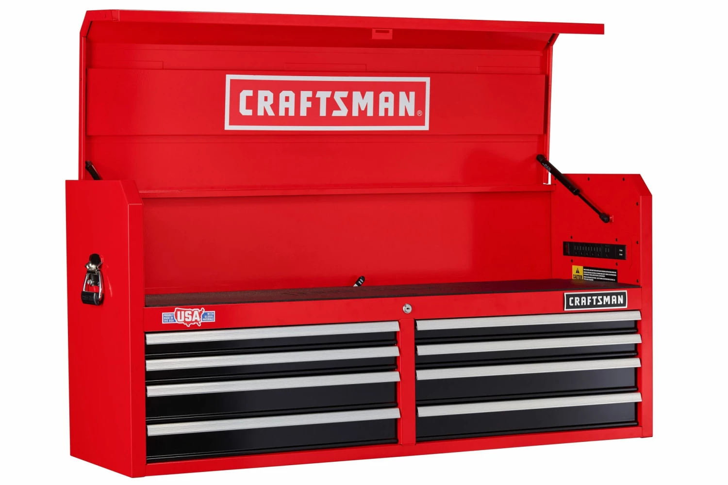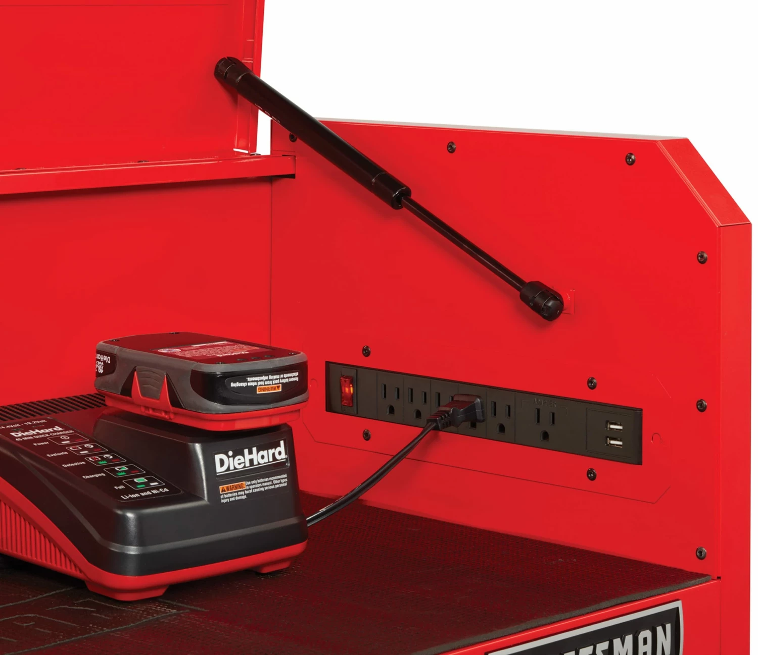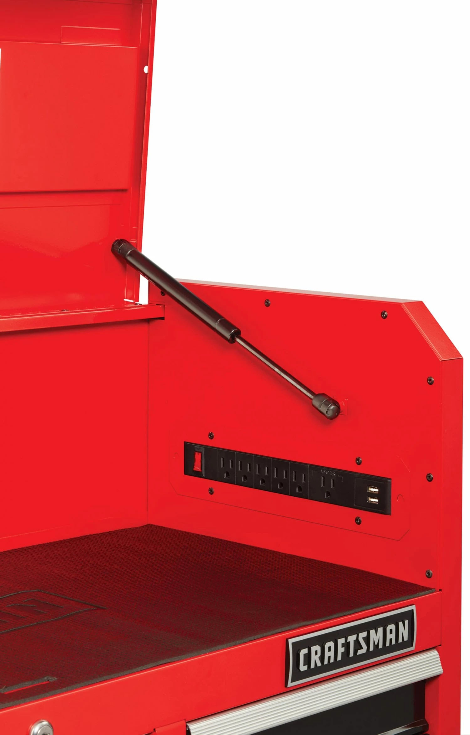 - EASY ACCESS: Gas struts support the tool chest lid and provide access to the charging area