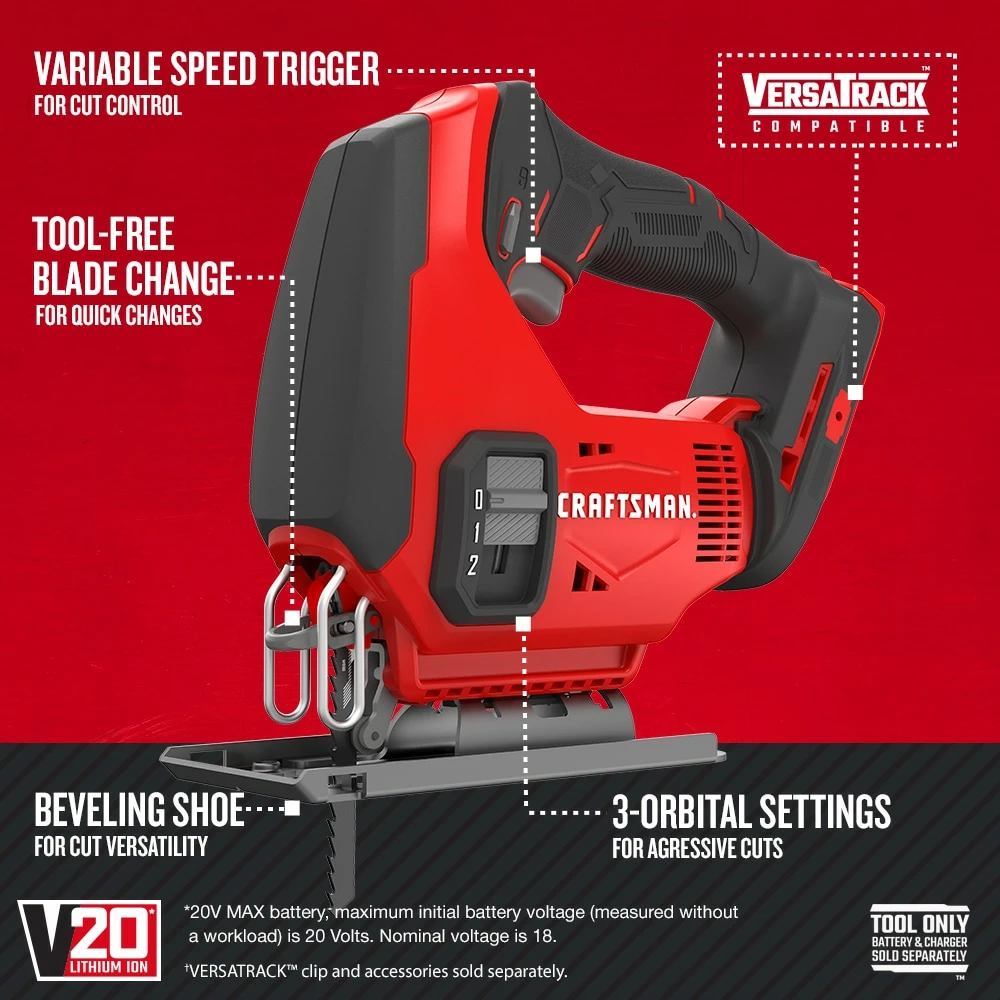 V20 Cordless Variable Speed Jig Saw (Tool Only) delivers precision in a wide range of applications. The 3-orbital setting allows for added cut aggressiveness while the lightweight design provides comfort grips helping to reduce user fatigue.
