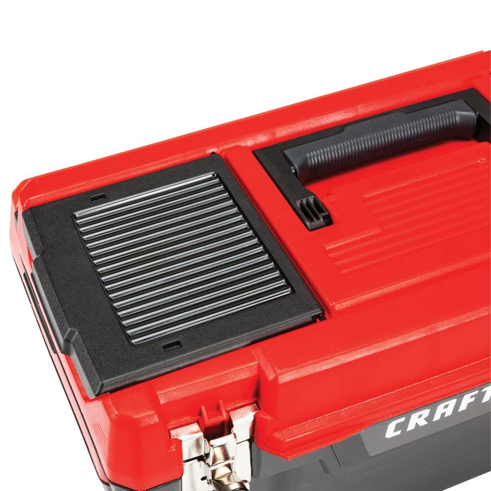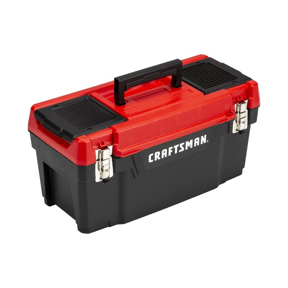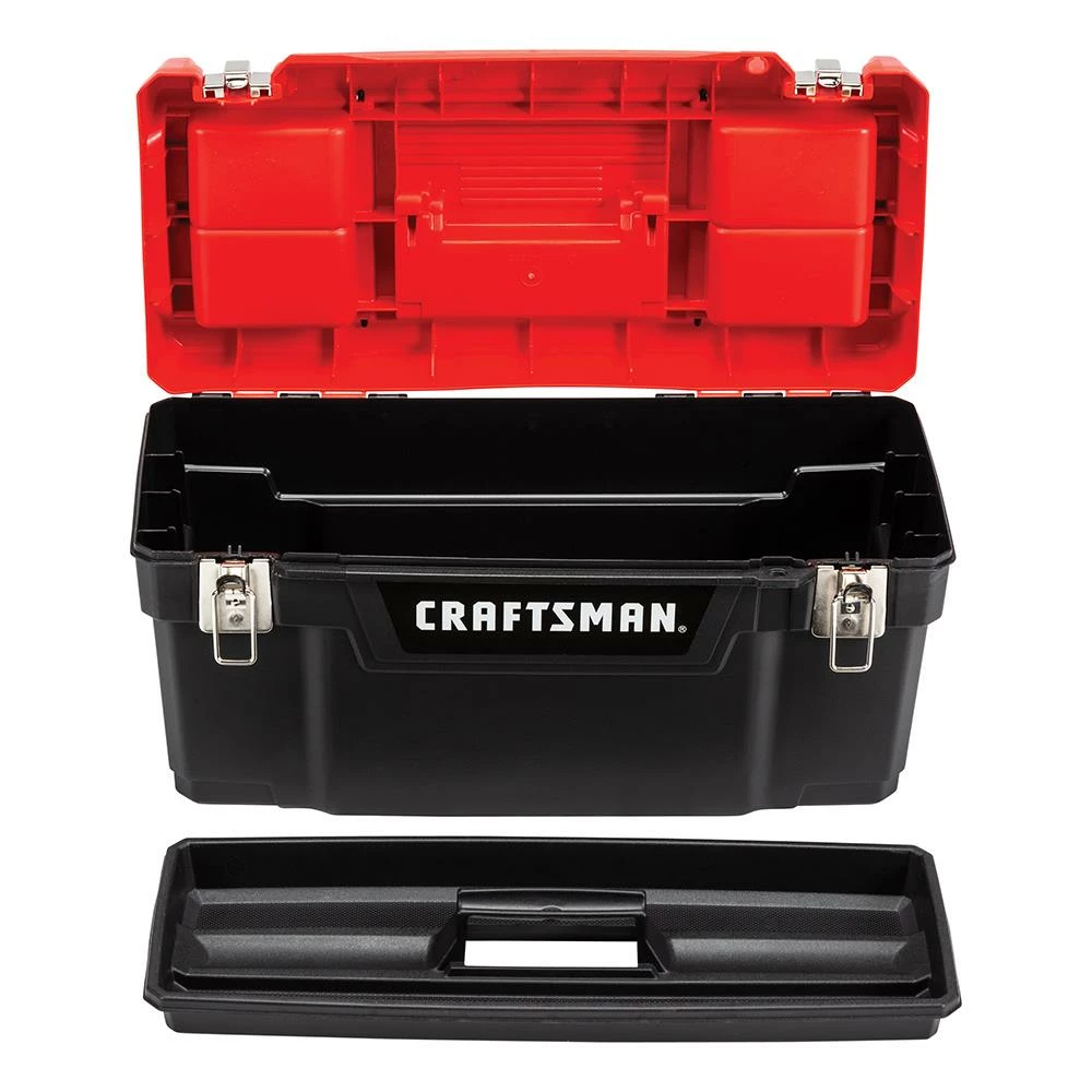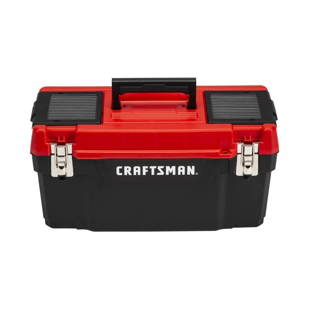 Keep your supplies neat, organized and in one central location for easy access with this CRAFTSMAN® 20-in Toolbox. It’s made of a sturdy material and comes pad lock ready (sold separately) for added safety. This plastic tool box has a spacious interior that you can use to hold a hammer, measuring tape, screwdrivers, a wrench and more. It also includes two top organizers and a removable tray that’s suitable for holding smaller handheld tools, screws, nuts and bolts and nails.
