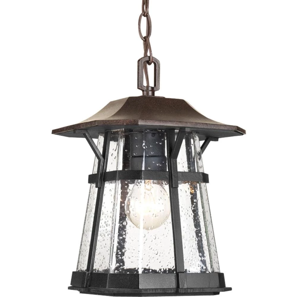 One-light hanging lantern from the Derby collection boasts a combination of espresso and textured black powder coated finishes. The seeded glass diffuser is encased in the cast aluminum black from with the espresso finish on the roof.