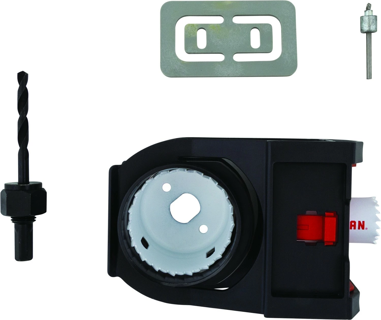 - Includes (1) 1-in Carbon Hole Saw; (1) 2-1/8-in Carbon Hole Saw; (1) Door Jig; (1) Latch Plate Template; (1) Router Bit; (1) Arbor with Pilot; (1) Bushing