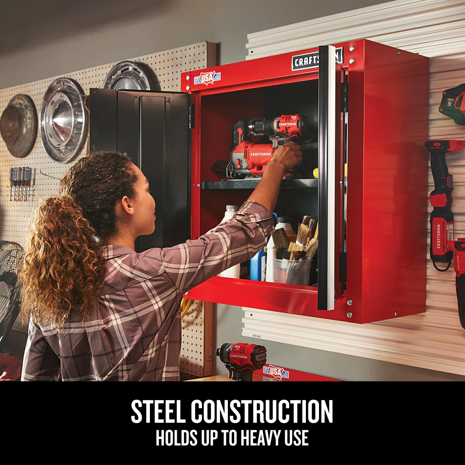 Proudly made in the USA with global materials in Sedalia, Missouri. The CRAFTSMAN Garage Wall Cabinet for tool storage keeps tools off the ground so that you can quickly and easily locate the tool you need and save floor space. The cabinet offers a strong and durable garage organization solution to store power tools, hand tools, sockets, wrenches, and bit sets, and more.