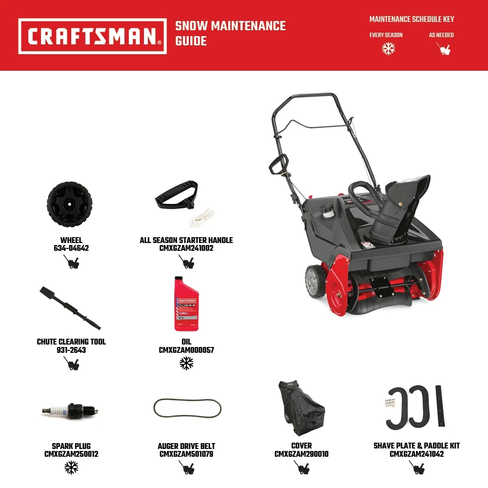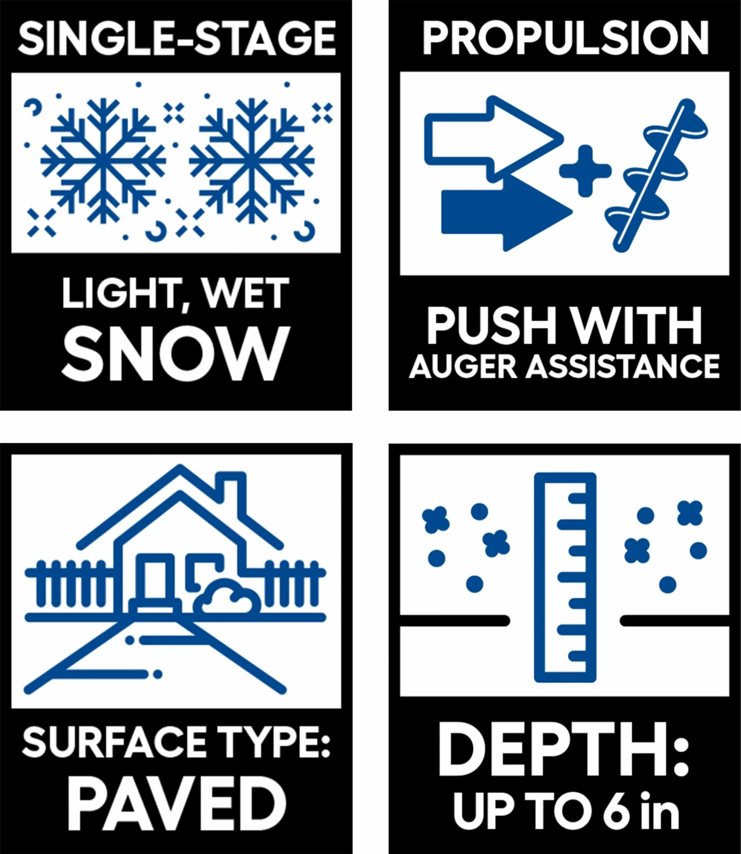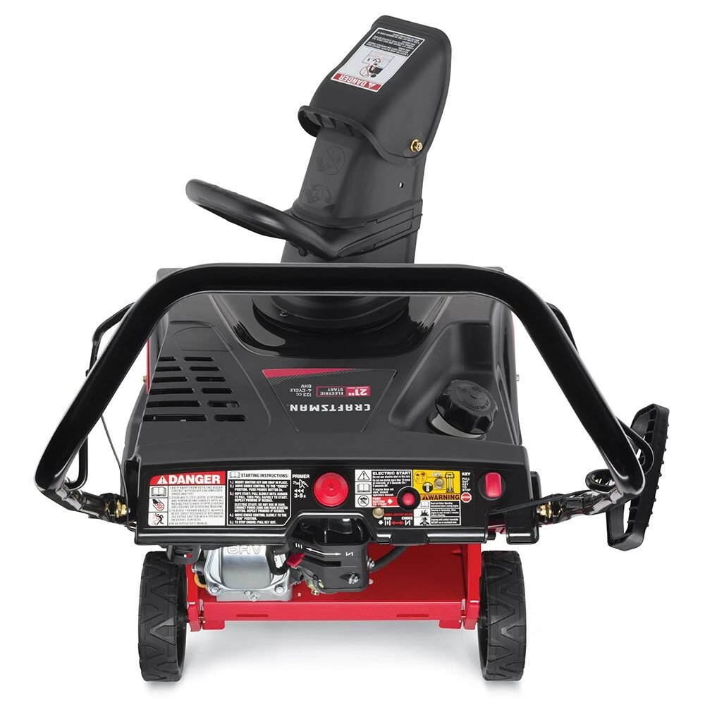 The 21-in. 123cc Electric Start Single-Stage Snow Blower is ideal for up to 6 inches of snowfall. Powered by a 123cc 4-cycle OHV engine, its push-button electric start eliminates pull-starting a cold engine along with the need to mix oil and gas, saving you time and energy on freezing mornings. Easy chute control lets you change the direction of snow discharge up to 190ΓΒ while the auger design grips ground for maximum clearing power. With a 21-in. clearing width and a 13-in. intake height, you can clear snow without the hassle.